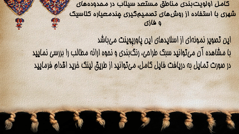 پاورپوینت کامل اولویتبندی مناطق مستعد سیلاب در محدودههای شهری با استفاده از روشهای تصمیمگیری چندمعیاره کلاسیک و فازی