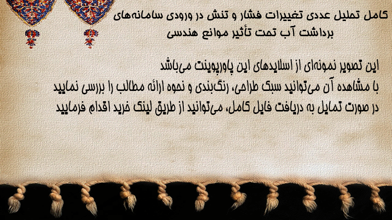 پاورپوینت کامل تحلیل عددی تغییرات فشار و تنش در ورودی سامانههای برداشت آب تحت تأثیر موانع هندسی