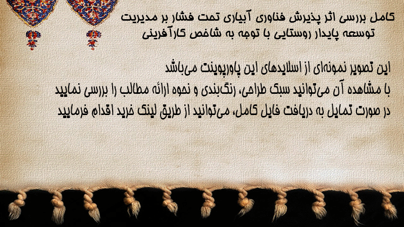 پاورپوینت کامل بررسی اثر پذیرش فناوری آبیاری تحت فشار بر مدیریت توسعه پایدار روستایی با توجه به شاخص کارآفرینی