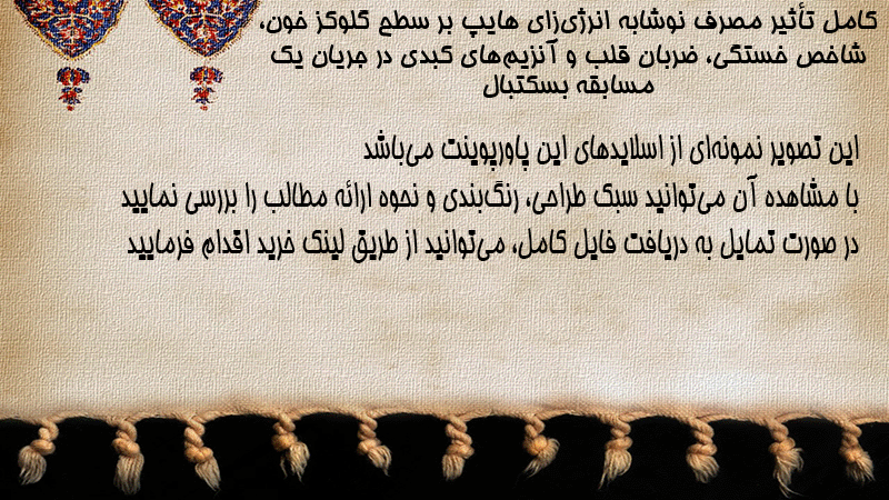 پاورپوینت کامل تأثیر مصرف نوشابه انرژیزای هایپ بر سطح گلوکز خون، شاخص خستگی، ضربان قلب و آنزیمهای کبدی در جریان یک مسابقه بسکتبال