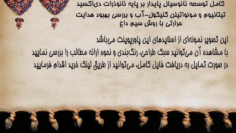 پاورپوینت کامل توسعه نانوسیال پایدار بر پایه نانوذرات دیاکسید تیتانیوم و مونواتیلن گلیکول-آب و بررسی بهبود هدایت حرارتی با روش سیم داغ