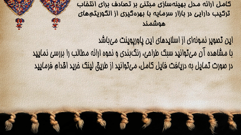 پاورپوینت کامل ارائه مدل بهینهسازی مبتنی بر تصادف برای انتخاب ترکیب دارایی در بازار سرمایه با بهرهگیری از الگوریتمهای هوشمند