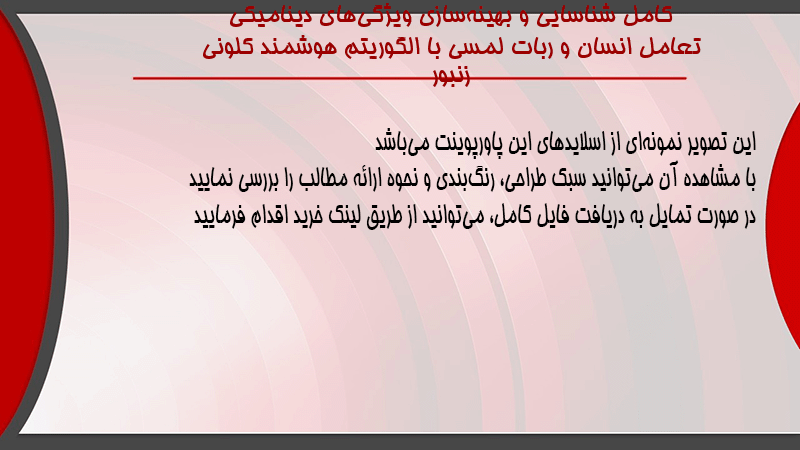 پاورپوینت کامل شناسایی و بهینهسازی ویژگیهای دینامیکی تعامل انسان و ربات لمسی با الگوریتم هوشمند کلونی زنبور