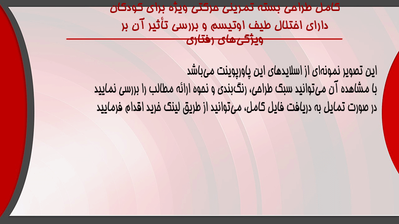پاورپوینت کامل طراحی بسته تمرینی حرکتی ویژه برای کودکان دارای اختلال طیف اوتیسم و بررسی تأثیر آن بر ویژگیهای رفتاری
