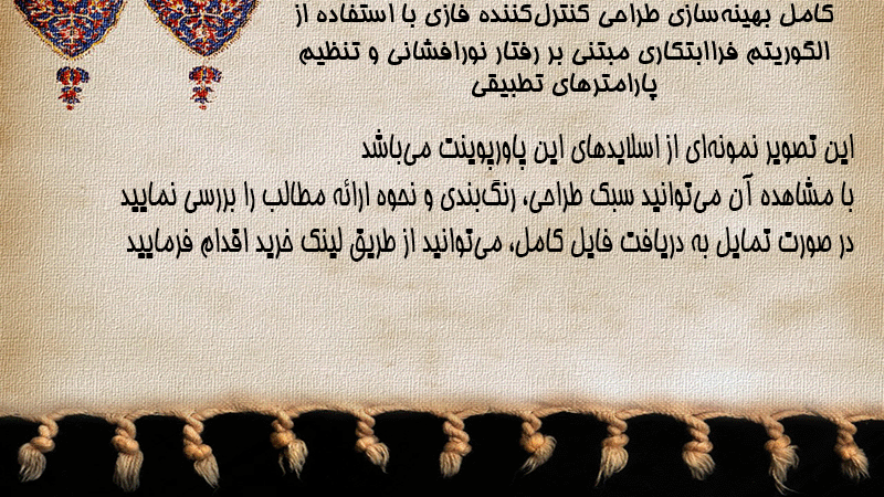 پاورپوینت کامل بهینهسازی طراحی کنترلکننده فازی با استفاده از الگوریتم فراابتکاری مبتنی بر رفتار نورافشانی و تنظیم پارامترهای تطبیقی
