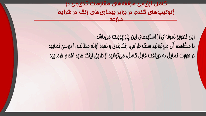 پاورپوینت کامل ارزیابی مؤلفههای مقاومت تدریجی در ژنوتیپهای گندم در برابر بیماریهای زنگ در شرایط مزرعه