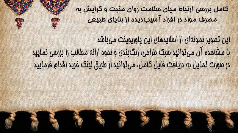 پاورپوینت کامل بررسی ارتباط میان سلامت روان مثبت و گرایش به مصرف مواد در افراد آسیبدیده از بلایای طبیعی