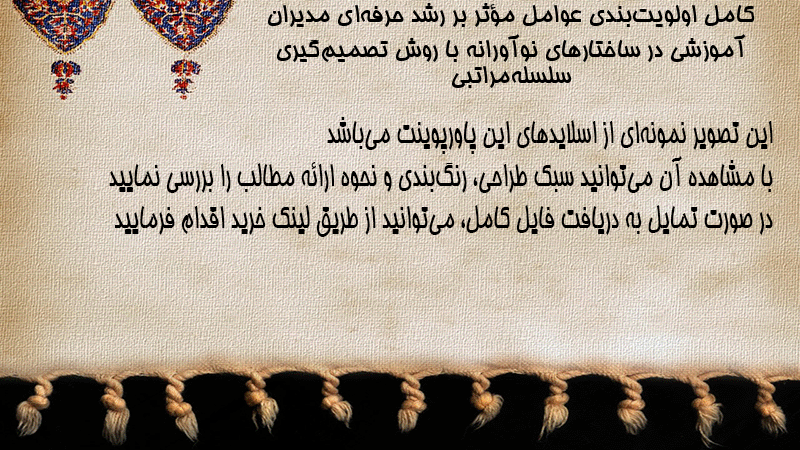 پاورپوینت کامل اولویتبندی عوامل مؤثر بر رشد حرفهای مدیران آموزشی در ساختارهای نوآورانه با روش تصمیمگیری سلسلهمراتبی