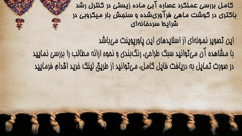 پاورپوینت کامل بررسی عملکرد عصاره آبی ماده زیستی در کنترل رشد باکتری در گوشت ماهی فرآوریشده و سنجش بار میکروبی در شرایط سردخانهای