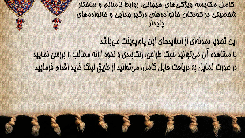 پاورپوینت کامل مقایسه ویژگیهای هیجانی، روابط ناسالم و ساختار شخصیتی در کودکان خانوادههای درگیر جدایی و خانوادههای پایدار