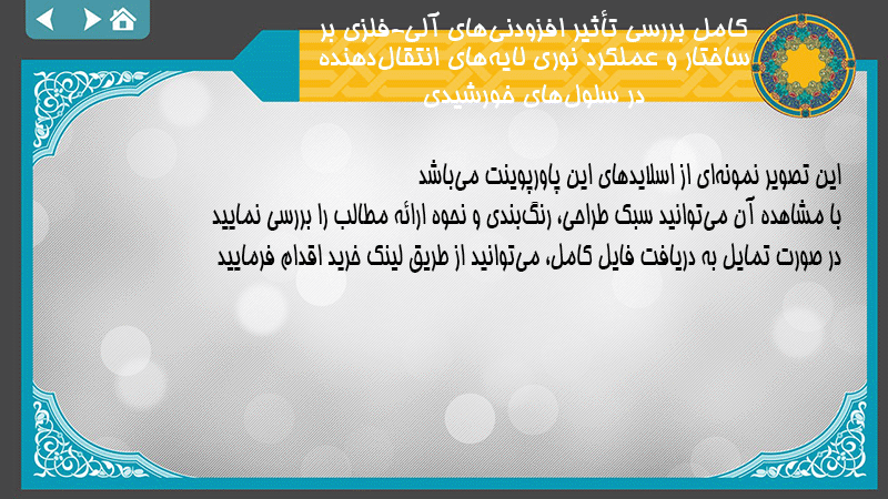پاورپوینت کامل بررسی تأثیر افزودنیهای آلی-فلزی بر ساختار و عملکرد نوری لایههای انتقالدهنده در سلولهای خورشیدی