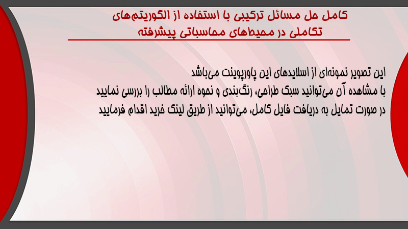 پاورپوینت کامل حل مسائل ترکیبی با استفاده از الگوریتمهای تکاملی در محیطهای محاسباتی پیشرفته
