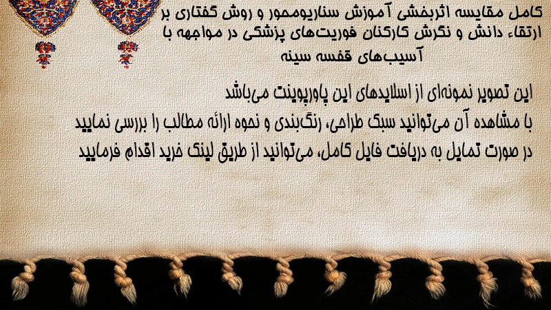 پاورپوینت کامل مقایسه اثربخشی آموزش سناریومحور و روش گفتاری بر ارتقاء دانش و نگرش کارکنان فوریتهای پزشکی در مواجهه با آسیبهای قفسه سینه