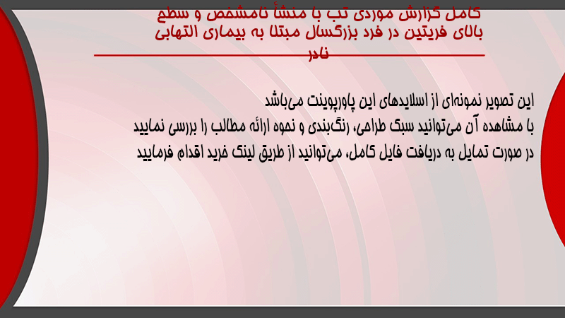 پاورپوینت کامل گزارش موردی تب با منشأ نامشخص و سطح بالای فریتین در فرد بزرگسال مبتلا به بیماری التهابی نادر