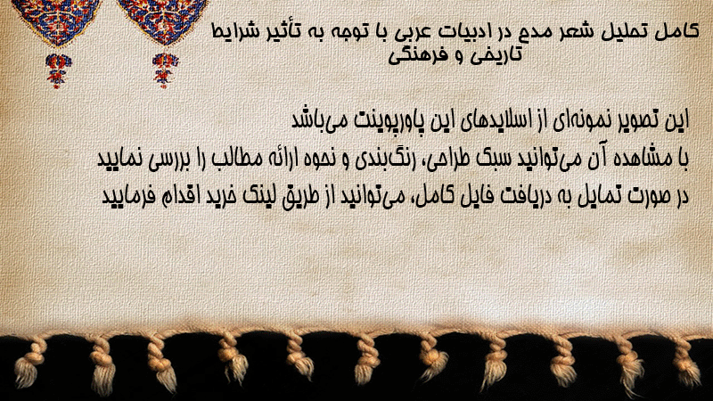 پاورپوینت کامل تحلیل شعر مدح در ادبیات عربی با توجه به تأثیر شرایط تاریخی و فرهنگی