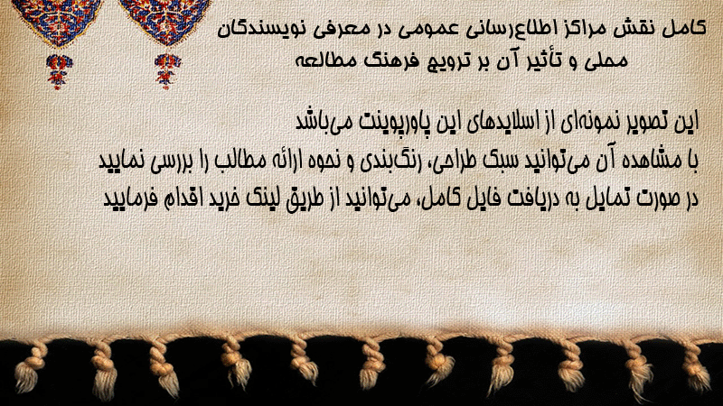 پاورپوینت کامل نقش مراکز اطلاعرسانی عمومی در معرفی نویسندگان محلی و تأثیر آن بر ترویج فرهنگ مطالعه