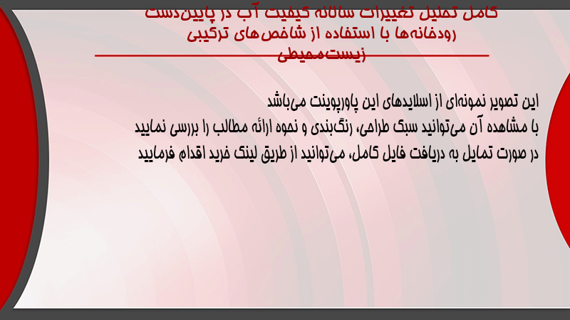 پاورپوینت کامل تحلیل تغییرات سالانه کیفیت آب در پاییندست رودخانهها با استفاده از شاخصهای ترکیبی زیستمحیطی
