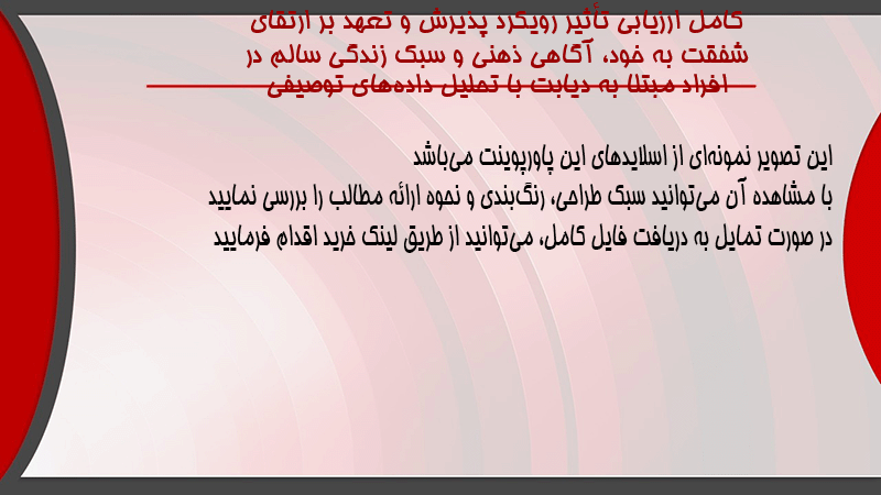پاورپوینت کامل ارزیابی تأثیر رویکرد پذیرش و تعهد بر ارتقای شفقت به خود، آگاهی ذهنی و سبک زندگی سالم در افراد مبتلا به دیابت با تحلیل دادههای توصیفی