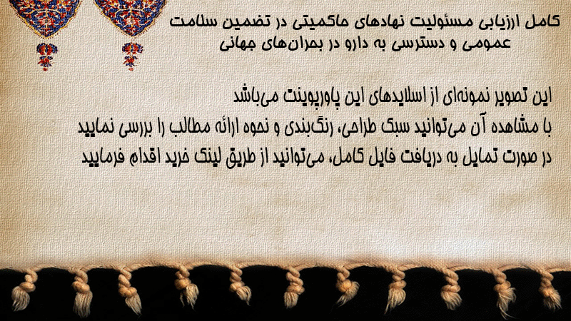 پاورپوینت کامل ارزیابی مسئولیت نهادهای حاکمیتی در تضمین سلامت عمومی و دسترسی به دارو در بحرانهای جهانی