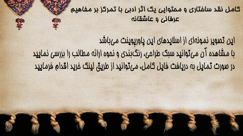 پاورپوینت کامل نقد ساختاری و محتوایی یک اثر ادبی با تمرکز بر مفاهیم عرفانی و عاشقانه