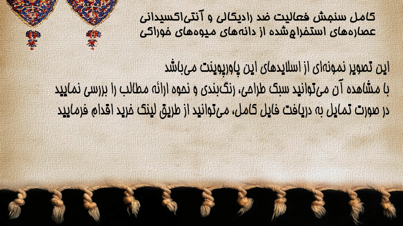 پاورپوینت کامل سنجش فعالیت ضد رادیکالی و آنتیاکسیدانی عصارههای استخراجشده از دانههای میوههای خوراکی