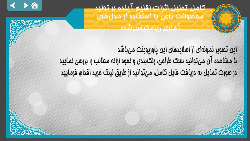پاورپوینت کامل تحلیل اثرات اقلیم آینده بر تولید محصولات باغی با استفاده از مدلهای آماری ریزمقیاسشده