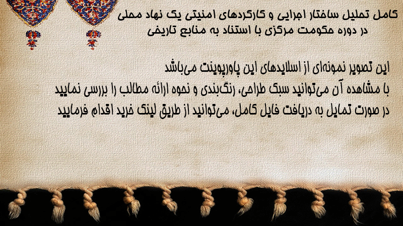 پاورپوینت کامل تحلیل ساختار اجرایی و کارکردهای امنیتی یک نهاد محلی در دوره حکومت مرکزی با استناد به منابع تاریخی